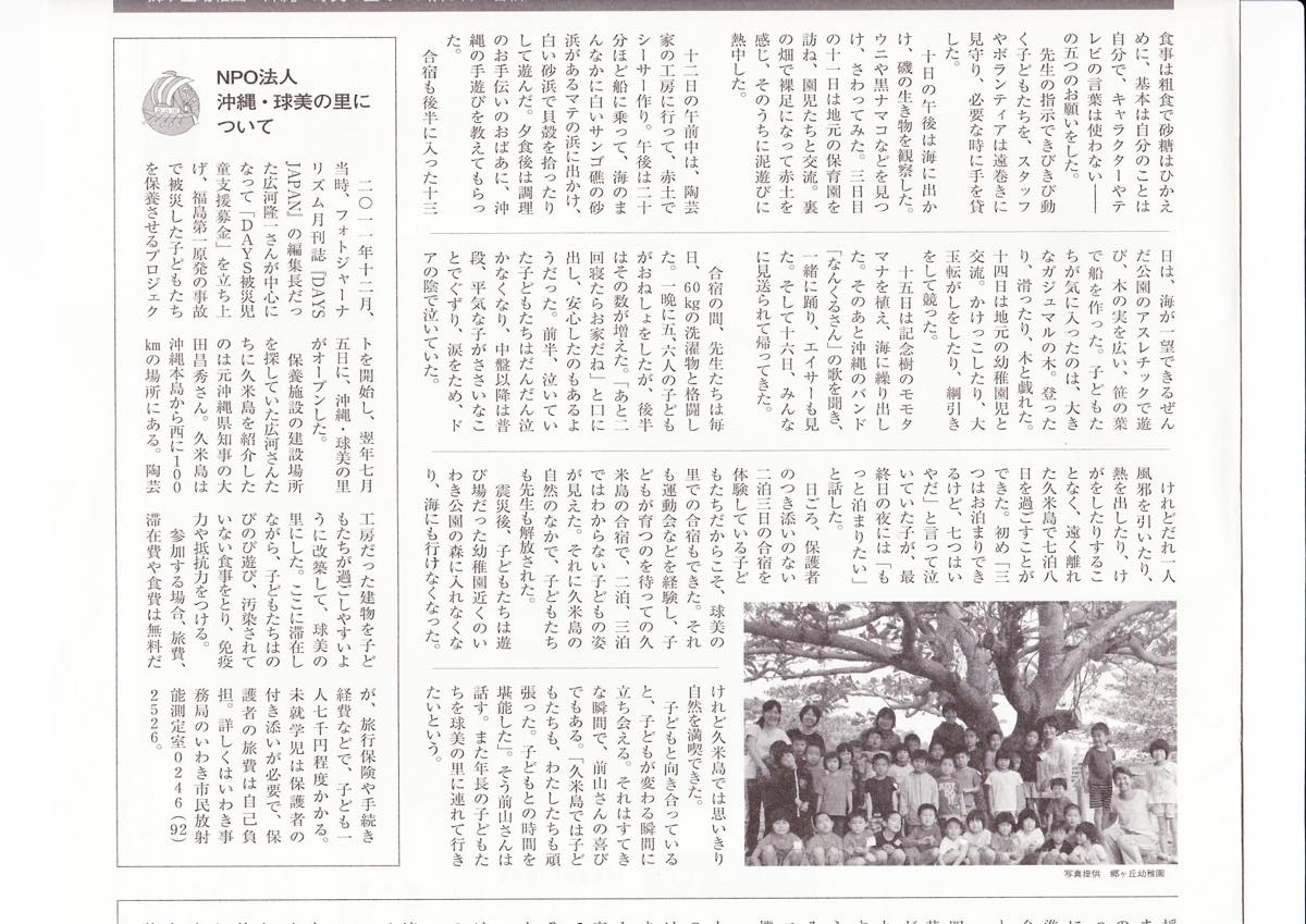 この連載は「いわき放射能市民測定室たらちね」の取り組みを伝えるものですが、5月27日~6月2日の記事では球美の里がフォーカスされており、久米島に保養施設をつくることになった経緯などが紹介されています。