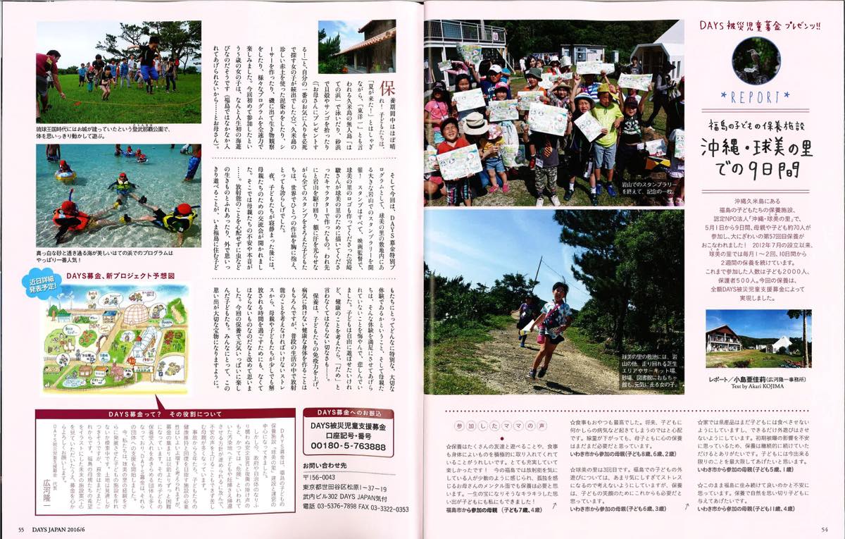 フォトジャーナリズム月刊紙「DAYS JAPAN」2016年6月号で「福島の子どもの保養施設 沖縄・球美の里での9日間」という記事が掲載され、第57次保養の様子が紹介されました。