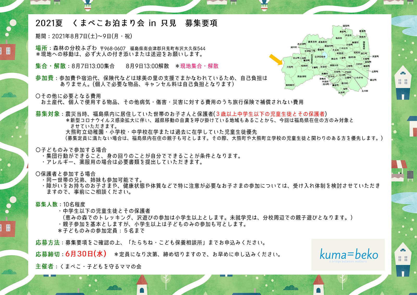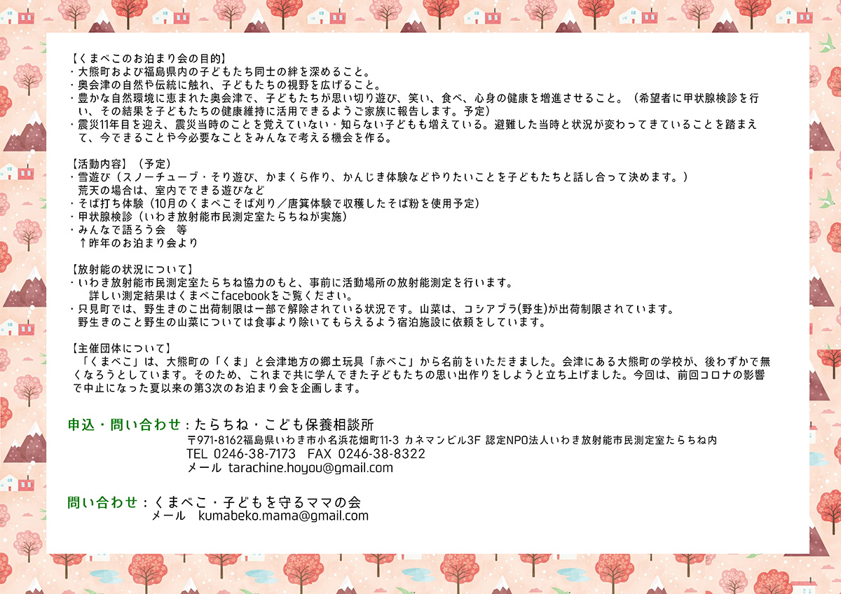 申込用紙に必要事項を記載の上、メール、郵便(締切日必着のこと)またはファックスにて「たらちね・こども保養相談所」までご連絡ください。