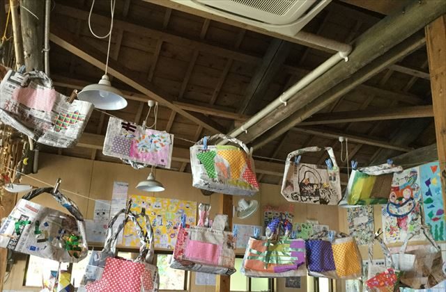 雨の日のプログラム。新聞紙を使ってエコバッグやスリッパをつくります。つくったバッグやスリッパに折り紙を切り貼りして、オリジナルの作品ができあがります。