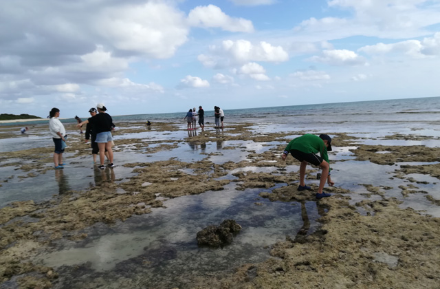 久米島在住のインタープリターの小川さんと、磯にいる生物を実際に見たり触ったりするプログラムです。はじめに説明を聞いた後、ビーチに行って観察をします。魚や貝、ヒトデ・ナマコなど、色んな生き物達との出会いにドキドキワクワク。わからない生き物がいると、小川さんが優しく教えてくれます。