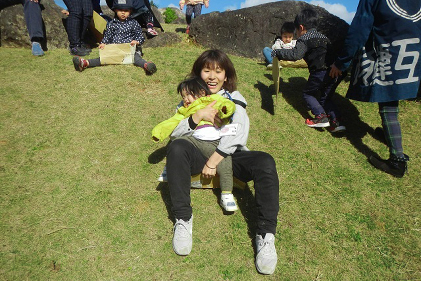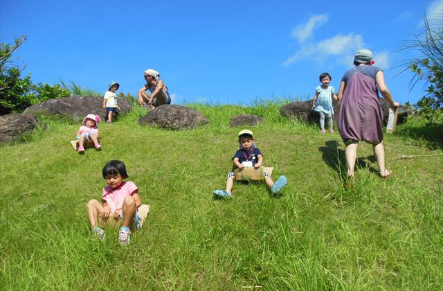久高台にある海が見える見晴らしのいい公園。全面芝生で坂が多いので、ダンボールでそりすべりをしたりして遊びます。子ども達に大人気の遊びです。