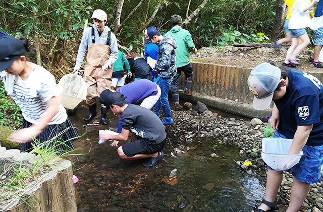 久米島の貴重な生き物達に触れ、自然の大切さを学ことができる施設です。五感を使って、虫や花を見つけるビンゴゲームをしたり、近くの小川や沼で魚や生き物を捕まえて観察することができます。自然の中で、たくさんの生き物に触れ、みんなが活き活きするプログラムです。