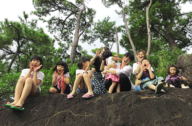 球美の里の中にある岩山は子ども達の遊び場です。ごつごつとした大きな岩が広がる山には、久米島の珍しい花々や植物が生えています。そこで、スタッフと一緒にスタンプラリーや宝探しなどのゲームをします。