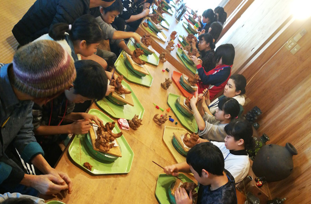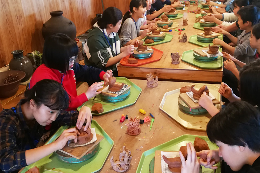 球美の里のすぐそばの「やちむん土炎房」で、シーサーを作ります。粘土から形をつくる「作り」とすでにあるシーサーに色をぬる「絵付け」、2種類どちらか選べます。子ども達それぞれのセンスや個性が光るプログラムです。
