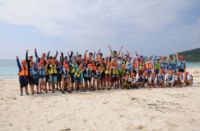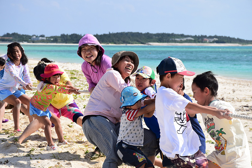 久米島の東にある東洋一の「砂浜だけの島」。船に乗って20分ほど、360度見渡す限り、白い砂浜と青い海がひろがる美しい島です。夏の時期は、みんなで泳いだり、砂遊びをしたり、海でのびのびと過ごします。泳げない時期は、浜辺で貝殻拾いやサンゴ拾いをしたりして過ごします。